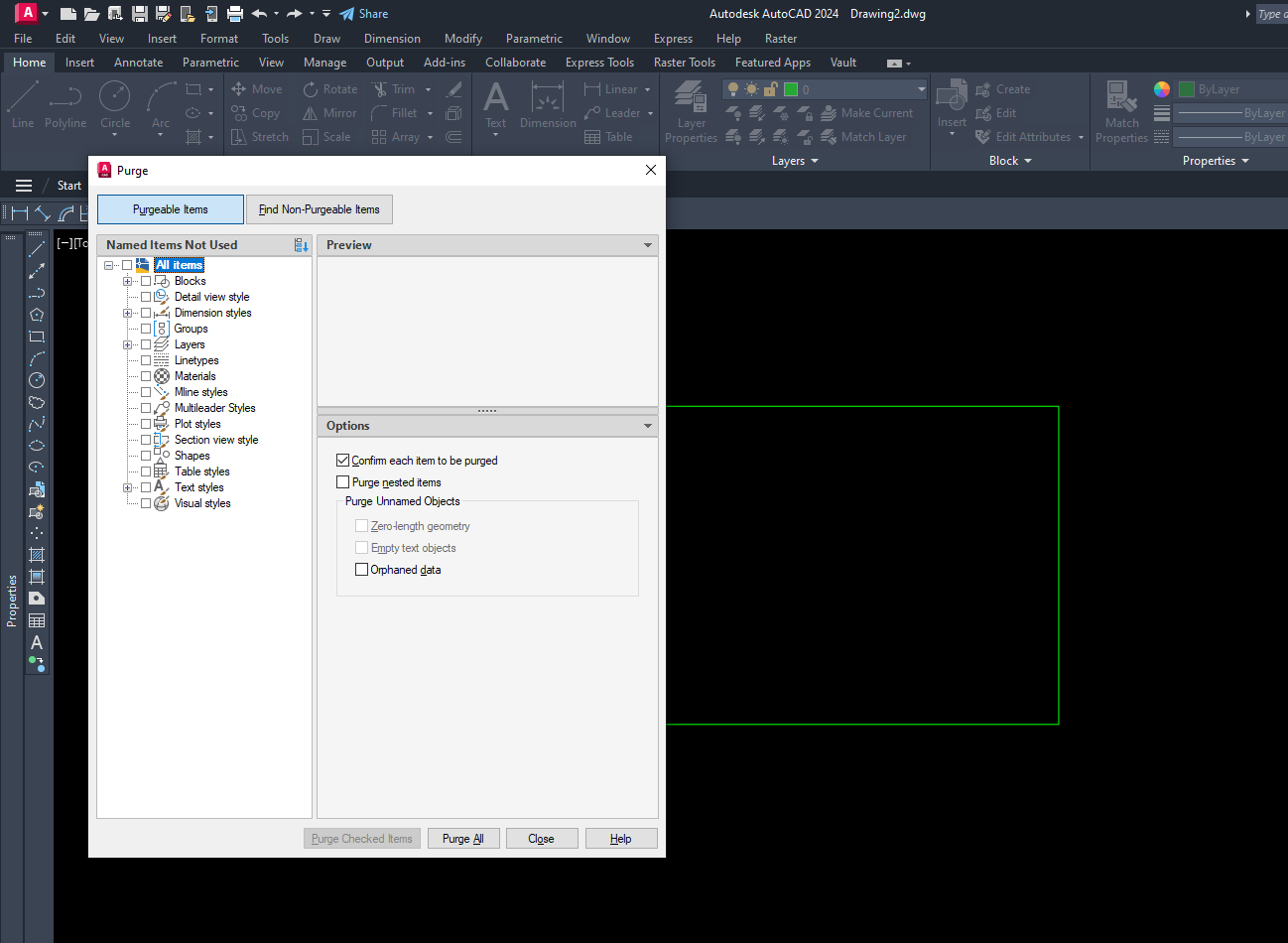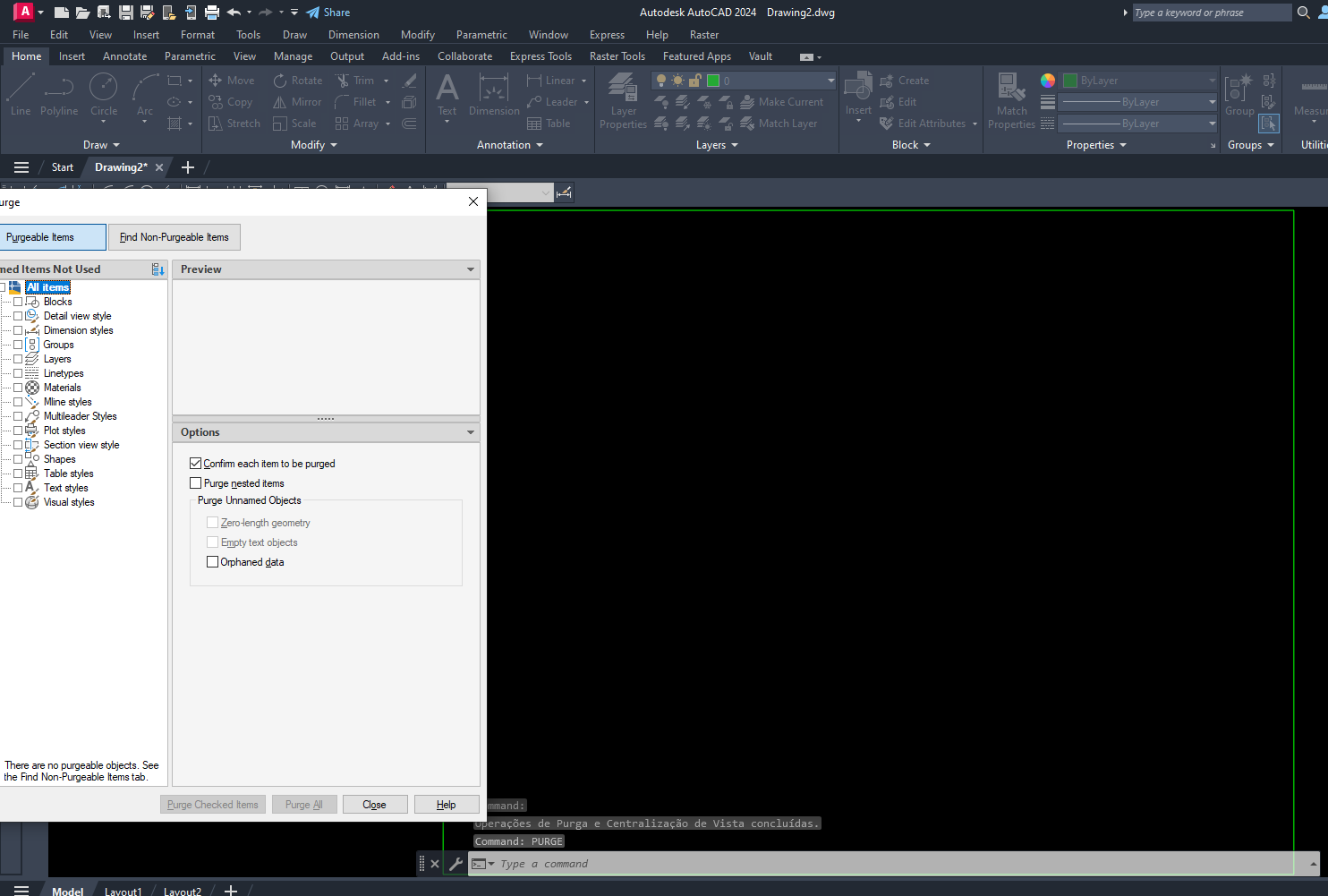 Esse script automatiza Purga tudo que está no desenho, e centraliza a vista. Note a demonstração nas imagens 01 e 02.