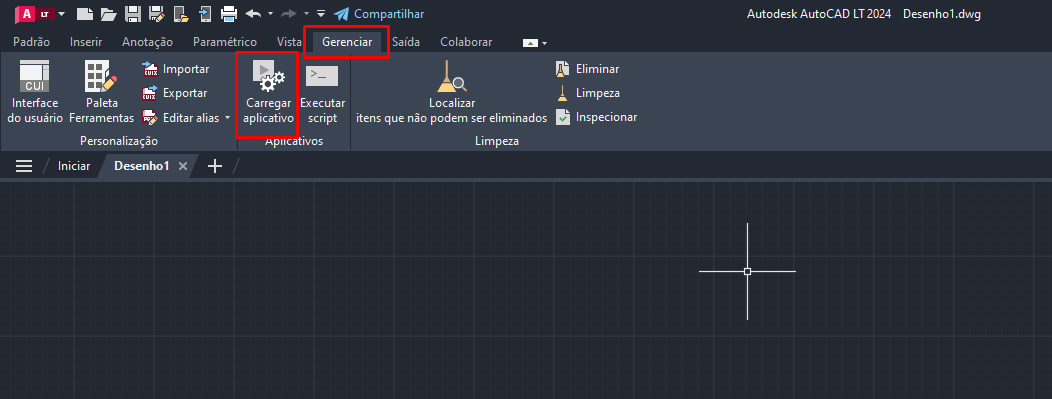 No canto superior esquerdo, vá na aba Gerenciar e depois na opção Carregar Aplicativo, conforme demonstrado na Imagem 01.