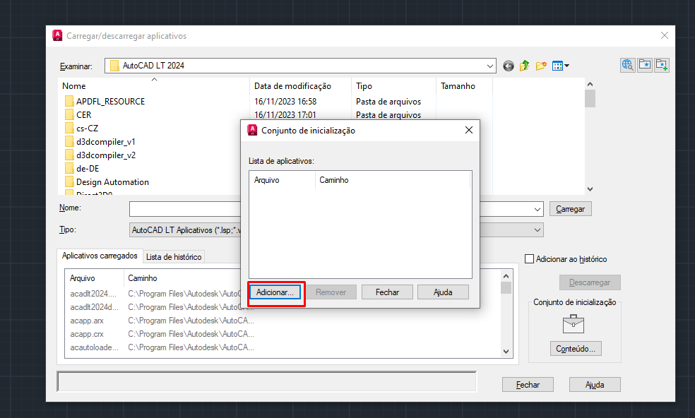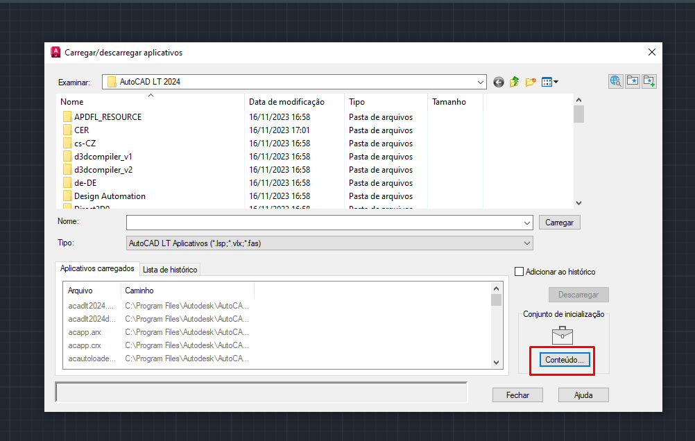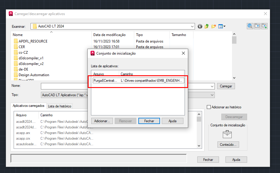 Após adicionar aquivo lisp ele deverá aparecer na Conjunto de inicialização, como mostra a Imagem 06.