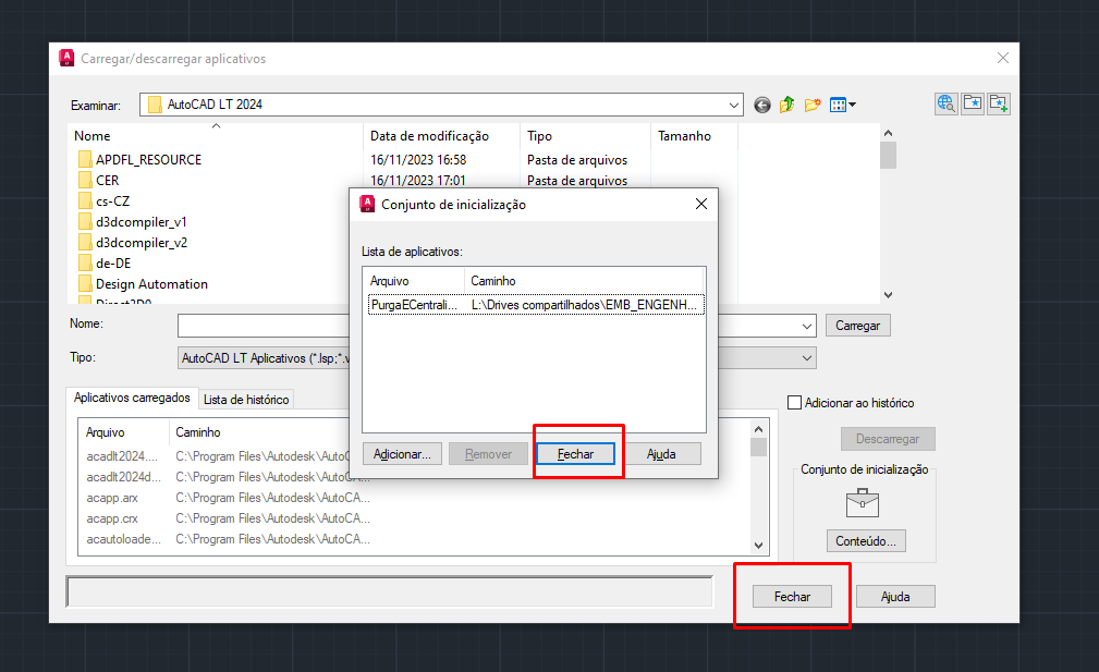 Feche a janela Conjunto de inicialização e a Carregar/descarregar aplicativos, e feche o AutoCAD, como indica a Imagem 07.