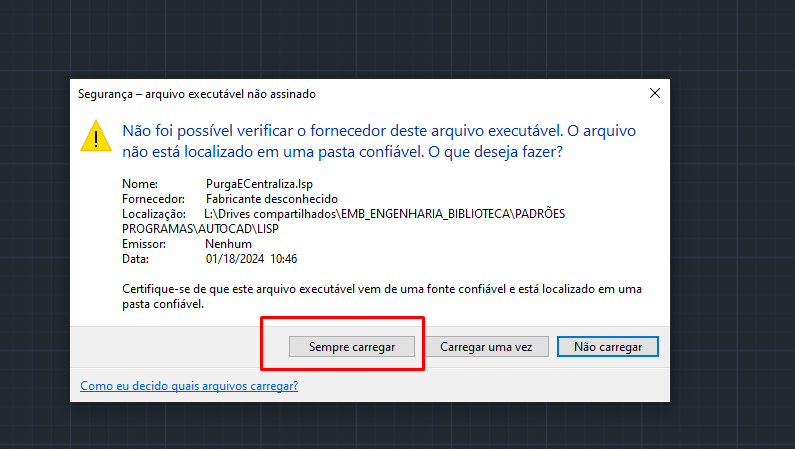 Abra denovo o AutoCAD e irá aparecer uma mensagem Segurança - arquivo executável não assinado, clique em Sempre carregar, como indicado na Imagem 08. Assim finaliza a configuração do comando.