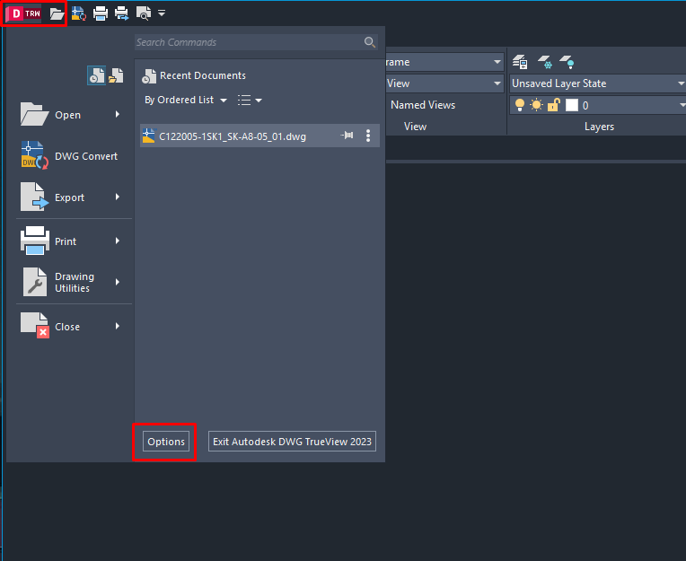 Clique ao ícone do DWG True Viewer ou do AutoCAD localizado no canto superior esquerdo da tela. Em seguida, clique nas opções como indicado na Imagem 01.