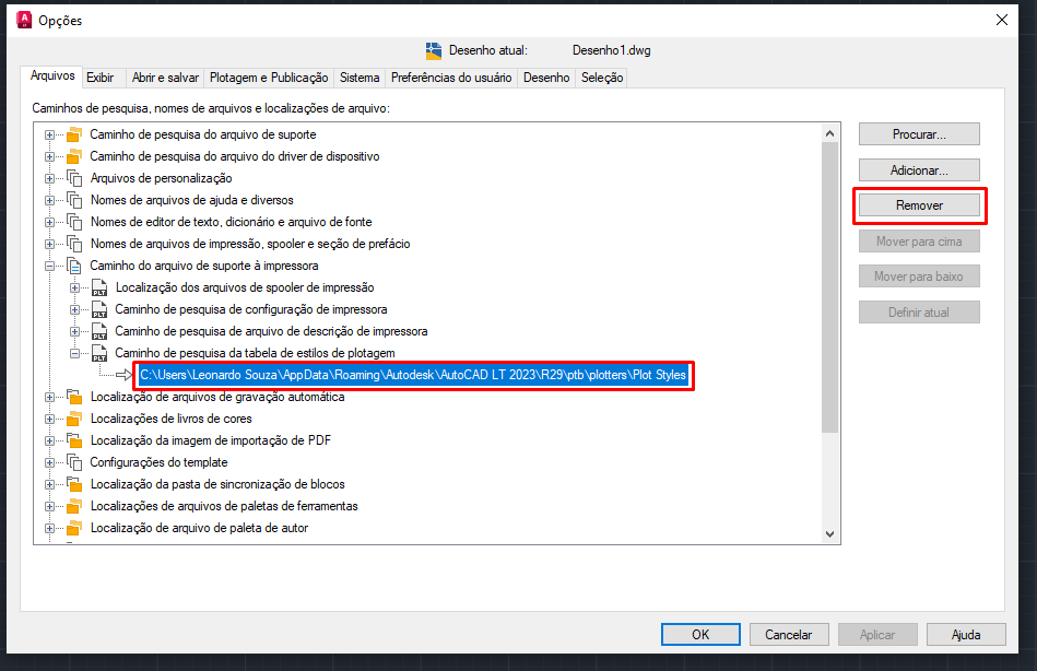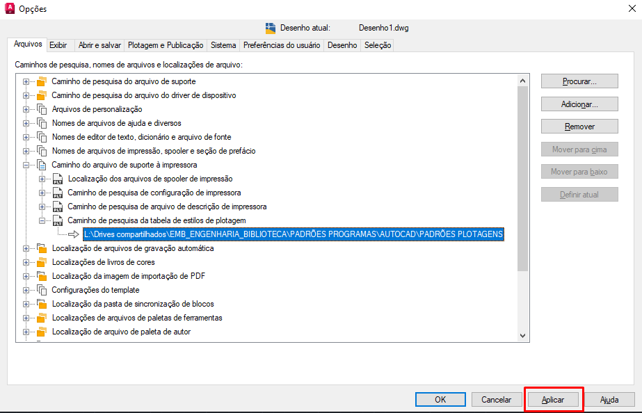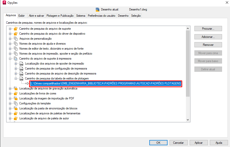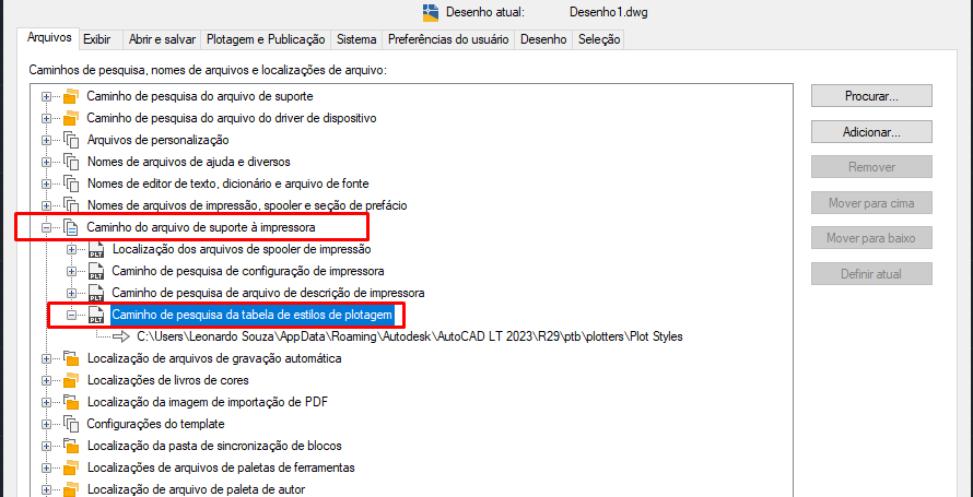 Abra a opção Caminho do arquivo de suporte à impressora, e seguida Caminho de pesquisa da tabela de estilos de plotagem. Essas opções estão destacadas na Imagem 02.