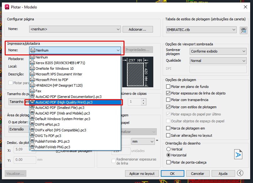 Dentro da seção de Impressora/Plotadora, você pode escolher caso queira o PDF ou Imprimir direto na impressora. Neste tutorial, vamos prosseguir com PDF, para isso utilizamos o AutoCAD PDF (High Quality Print).pc3, note essa opção na Imagem 07.
