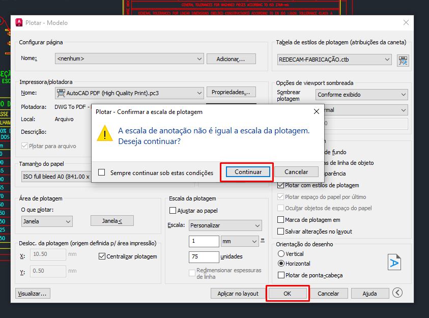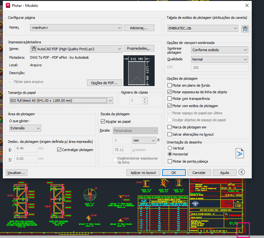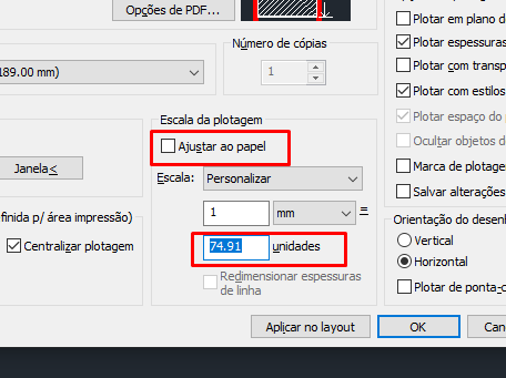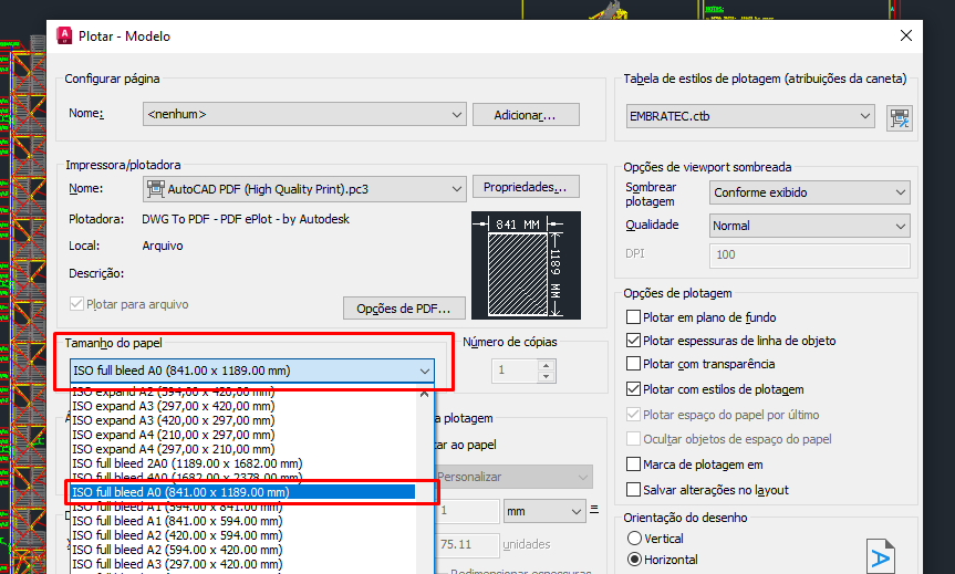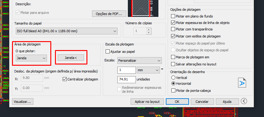 - Se você estiver trabalhando com o formato A0, será necessário ajustar a escala para garantir que o desenho seja impresso de forma adequada. Certifique-se de acessar a