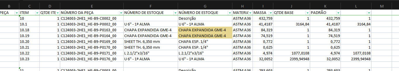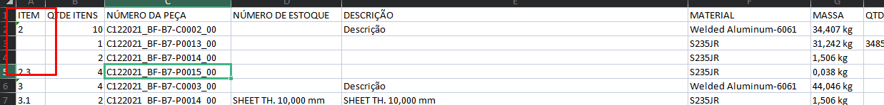 Quando o Inventor extrai uma lista, ele tenta simplificar com base no número da peça. No entanto, no caso da Imagem 11, mesmo que o código seja o mesmo, hÔ algumas diferenças, como a presença de furos, o que resulta Varia no peso.