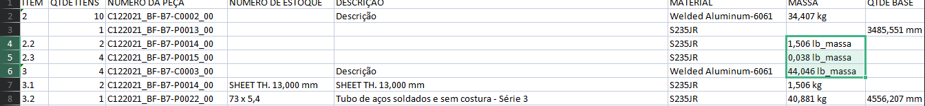 Isso ocorre quando na coluna da massa aparece em Libra invƩs de Kilograma, como demonstrado na Imagem 05.