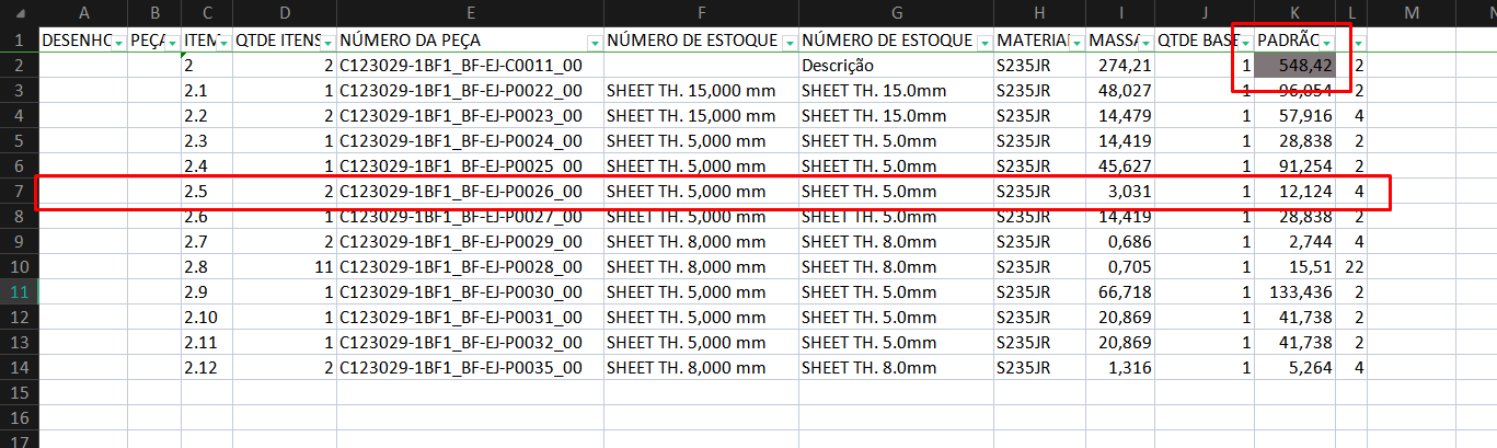 O peso da peƧa Ʃ calculado multiplicando o peso unitƔrio do subcomponente pela quantidade, resultando no peso total da peƧa. Na Imagem 08, podemos observar que o item 2.5 estƔ com o peso unitƔrio incorreto, o que impacta o cƔlculo final.