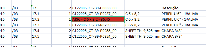 A soma dos pesos das peças tem que ser igual à da lista de materiais. Em caso de divergência, a aba da planilha serÔ destacada em vermelho, como desmostrado na Imagem 12.