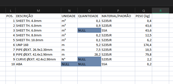 Este erro ocorre quando a Chloe tenta calcular a quantidade a partir do Peso correspondente, mas não consegue devido à ausência de alguma informação, a celula serÔ pintada azul e escrito NULL, como demostrado na Imagem 13.