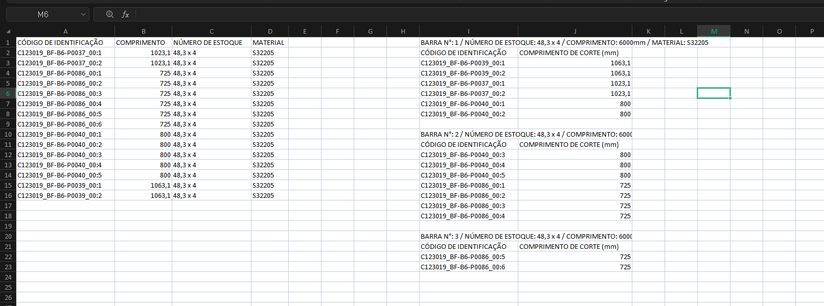 Durante a execução do algoritmo para a realização do estudo, é considerado um acréscimo de 6 mm no comprimento das peças, representando a perda decorrente do corte realizado pela serra. Essa consideração é aplicada universalmente, exceto nos casos em que a peça possui exatamente 6000 mm de comprimento.
