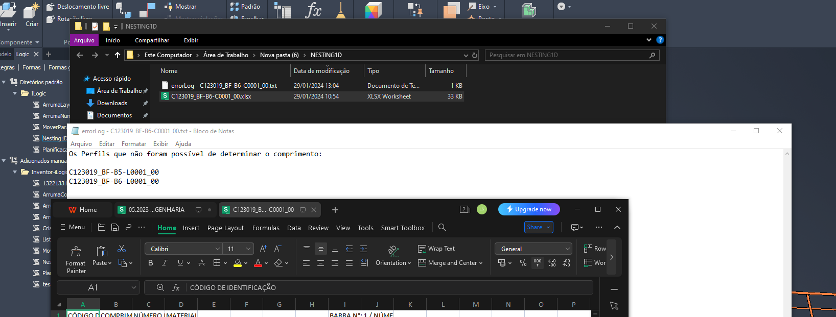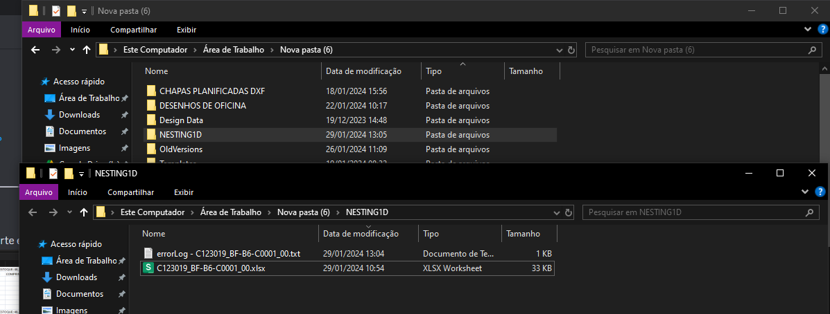Será criada, na mesma pasta onde o modelo está salvo, uma pasta chamada NESTING1D. Nela, será possível encontrar um arquivo Excel que contém o estudo de corte e um arquivo de texto que exibe a mesma mensagem de erro descrita no Passo 01. Note nas Imagens 03 e 04.